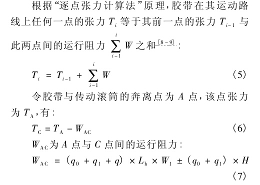 平穩(wěn)運(yùn)行。實(shí)際的設(shè)計(jì)計(jì)算表明,對(duì)于一般的皮帶輸送機(jī)凹弧段半徑的計(jì)算,式( 1) 的計(jì)算結(jié)果可滿足要求。但在某些條件下,式( 2) 、( 3) 的計(jì)算結(jié)果也會(huì)大于式( 1) 的所得,從而導(dǎo)致半徑過大給工藝布置帶來一定的困難。查式( 2) 、( 3) ,可采取加大拉緊力的方法以增大Tc值,使其計(jì)算結(jié)果得到減小。下面將討論凹弧段起始點(diǎn)張力Tc的計(jì)算方法。