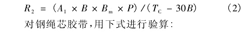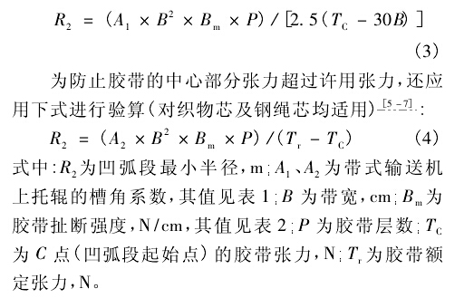 由式1可計(jì)算得出凹弧段的最小半徑。但是當(dāng)膠帶的張力過低時(shí),膠帶的邊緣處有可能產(chǎn)生皺曲,將無法保證皮帶輸送機(jī)的安全運(yùn)行,因此需對(duì)該半徑值進(jìn)行必要的校核。鑒于目前國內(nèi)尚無成熟的計(jì)算公式可循,建議采用美國輸送設(shè)備制造商協(xié)會(huì)聯(lián)合會(huì)推薦的公式對(duì)最小半徑進(jìn)行驗(yàn)算,以保證膠帶具有足夠張力,避免在凹弧段處的膠帶邊緣出現(xiàn)零張力'對(duì)織物芯膠帶,用下式進(jìn)行驗(yàn)算: